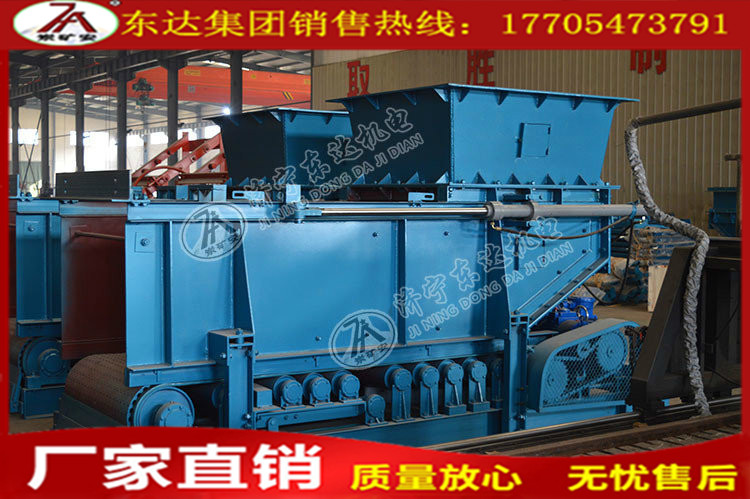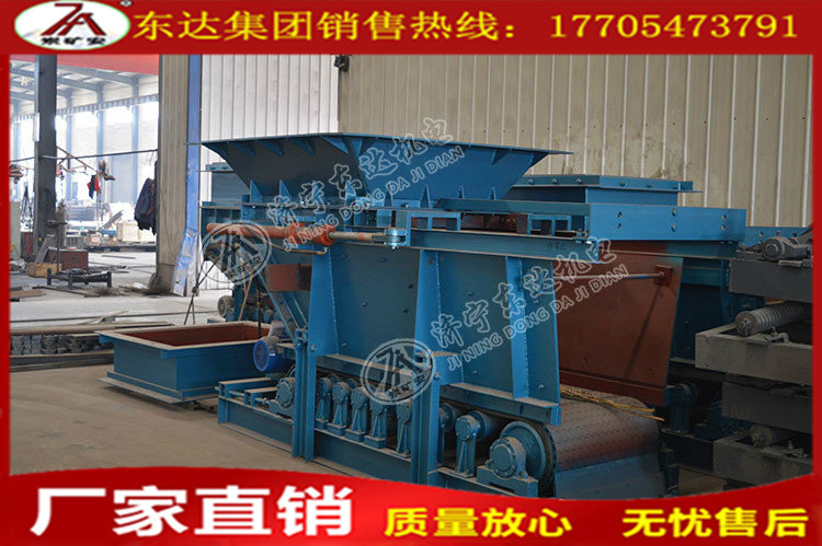 联接段安装于料仓口部,在其下安装导料槽,在导料槽下安装甲带给料装置;甲带给料装置由驱动滚筒、缓冲托辊及支架、改向滚筒、甲带、胶带、下护板等 机构所组成;驱动装置由无级变速减速机经链传动带动驱动滚筒;驱动装置和甲带给料装置均安装在托架上,并可调整位置;在导料槽上,安装有闸门机构和驱动手 轮,在维护时实现出料口的开闭。